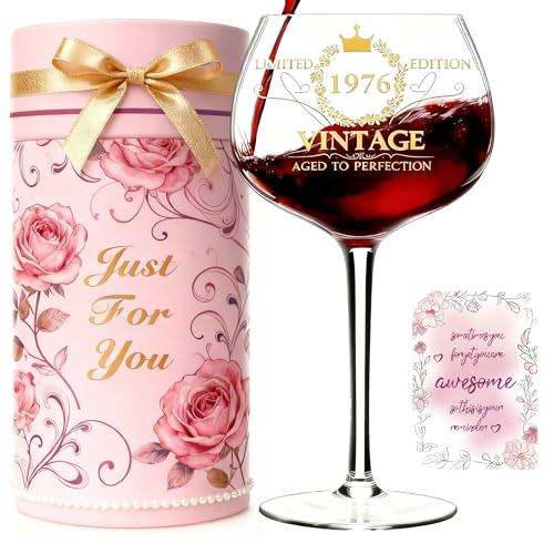 - Impress Her at First Sight: Having a headache about choosing a gift for wine loving women? Try this Unique Custom 1976 Wine Gift Box for her! Our gift box is beautifully designed with an elegant touch. No need to repackage.Clear and legible printing “ VINTAGE 1976” on the glass is ready to celebrate her 50th birthday or anniversary