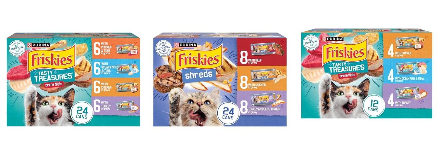 Introducing the Purina Friskies Wet Cat Food Variety Pack, Tasty Treasures Prime Filets! This pack offers three delicious flavors: Ocean Fish and Tuna, Chicken, and Turkey. It’s designed to satisfy your cat’s taste buds with moist food that features tender textures and savory gravy or sauce. This variety pack makes mealtime exciting for your feline friend.