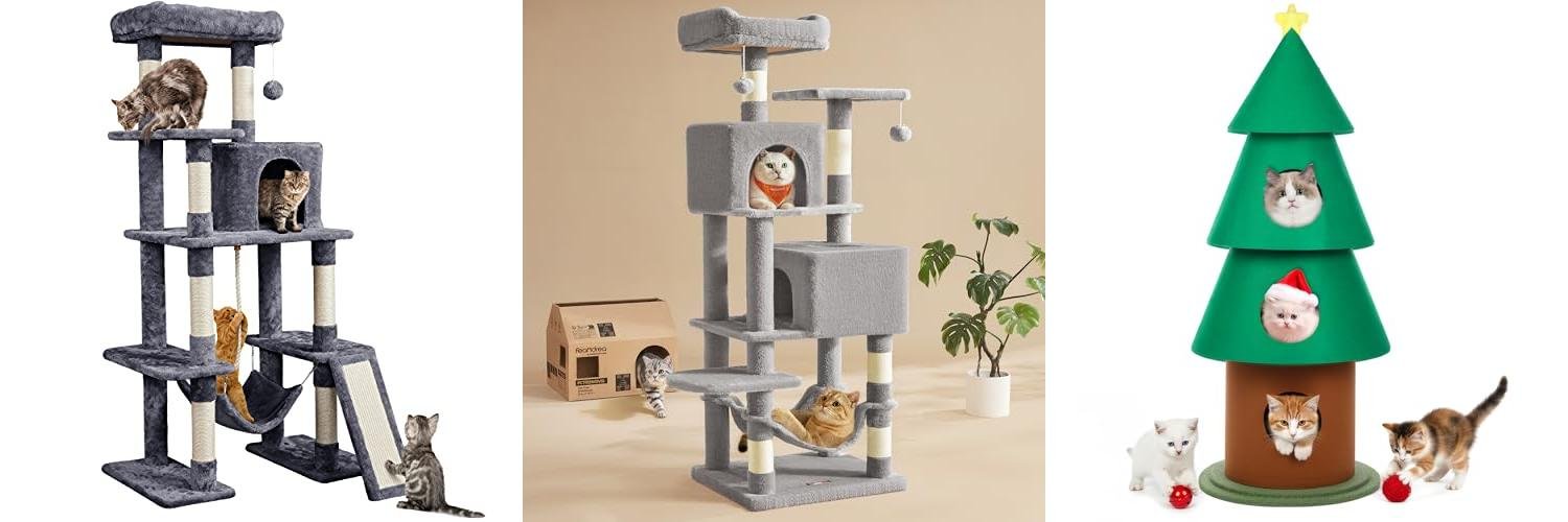 - This cat tree is a true activity center. It features three top perches and two cozy condos. Your cat can stretch out, nap in a soft spot, or get their scratching fix on the sisal-covered posts. It also comes with two fun toys to keep them entertained!