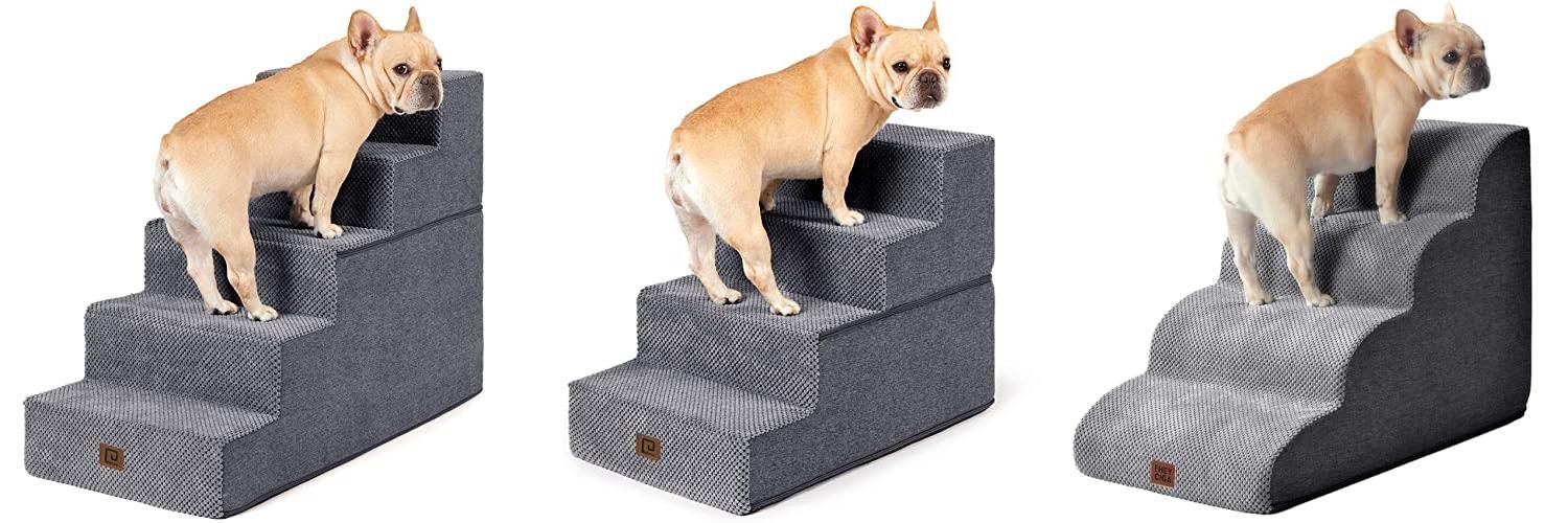 • Steady & Foldable: Made with 30D high-density foam and an eco-friendly support board, these stairs are very stable. They can also fold into a basic dog bed for your pet to rest on.