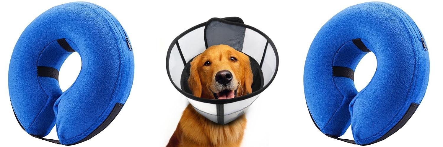 - Inflatable Collars: These look like neck pillows and are inflated with air. They allow dogs to eat, drink, and see more easily. However, they are not suitable for wounds on the head or face, and some dogs can still reach certain areas.