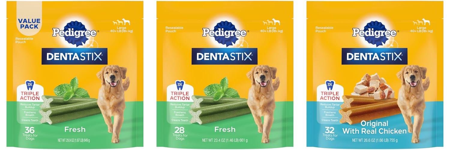 Overall, Pedigree Dentastix offers a simple and tasty way to support your large dog’s dental hygiene. These treats make a positive difference in your dog’s oral health and breath.