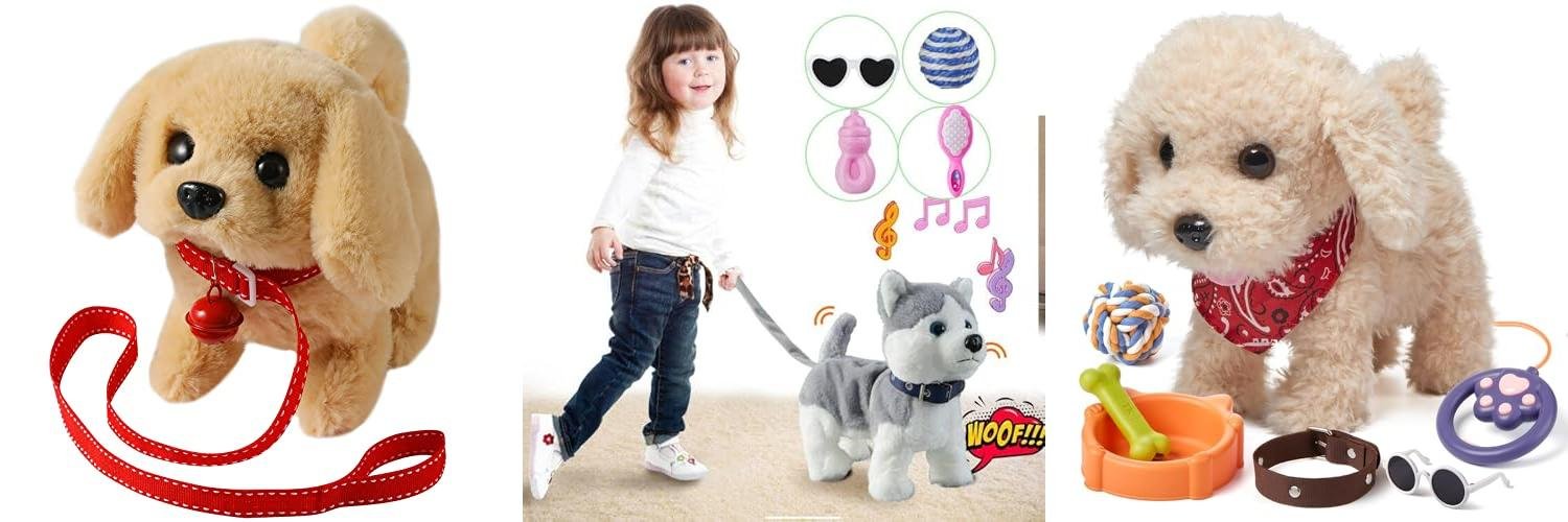 - This puppy offers fantastic fun! It walks, barks, stretches, and wags its tail just like a real dog. Kids will love tapping its head to hear it bark and watching it move on carpets and hard floors.