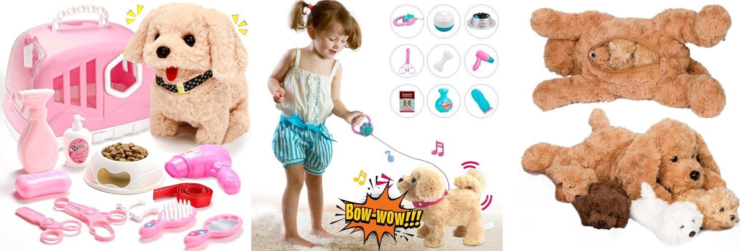 - This set includes a walking, barking motorized plush dog that truly mimics a real puppy’s actions.
