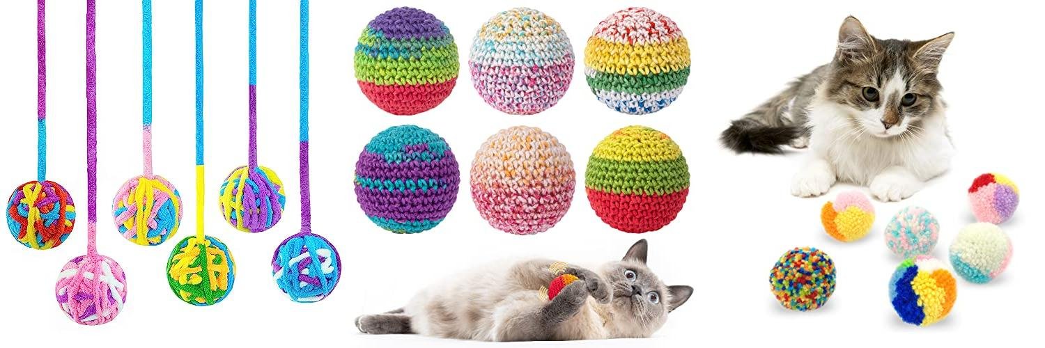 - Cute Cat Ball with String: The bright colors are eye-catching. The balls are very light. They are made from organic wool yarn. These are good for homes with more than one cat. You can even color-code them to see which one your cat plays with most.